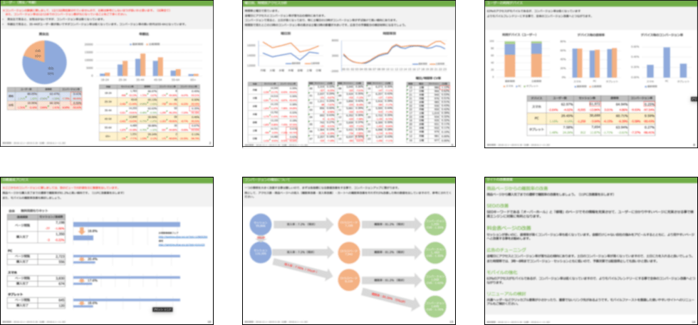 ユーザー行動分析からコンバージョンまでの現状を、数値から見やすいデータでレポートしますので、分かりやすい現状把握が出来ます。